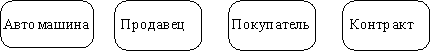 Обращаясь к приведенным выше выдержкам из интервью, видно, что сущности, которые могут быть идентифицированы с главным менеджером - это автомашины и продавцы. Продавцу важны автомашины и связанные с их продажей данные. Для администратора важны покупатели, автомашины, продавцы и контракты. Исходя из этого, выделяются 4 сущности (автомашина, продавец, покупатель, контракт), которые изображаются на диаграмме следующим образом (рисунок 2.19).
