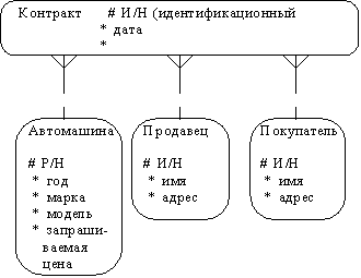 2.4. Моделирование данных2.4.1. Case-метод БаркераЦель моделирования данных состоит в обеспечении разработчика ИС концептуальной схемой базы данных в форме одной модели или нескольких локальных моделей, которые относительно легко могут быть отображены в любую систему баз данных. Наиболее распространенным средством моделирования данных являются диаграммы "сущность-связь" (ERD). С их помощью определяются важные для предметной области объекты (сущности), их свойства (атрибуты) и отношения друг с другом (связи). ERD непосредственно используются для проектирования реляционных баз данных. Нотация ERD была впервые введена П. Ченом (Chen) и получила дальнейшее развитие в работах Баркера [8]. Метод Баркера будет излагаться на примере моделирования деятельности компании по торговле автомобилями. Ниже приведены выдержки из интервью, проведенного с персоналом компании. Главный менеджер: одна из основных обязанностей - содержание автомобильного имущества. Он должен знать, сколько заплачено за машины и каковы накладные расходы. Обладая этой информацией, он может установить нижнюю цену, за которую мог бы продать данный экземпляр. Кроме того, он несет ответственность за продавцов и ему нужно знать, кто что продает и сколько машин продал каждый из них. Продавец: ему нужно знать, какую цену запрашивать и какова нижняя цена, за которую можно совершить сделку. Кроме того, ему нужна основная информация о машинах: год выпуска, марка, модель и т.п. Администратор: его задача сводится к составлению контрактов, для чего нужна информация о покупателе, автомашине и продавце, поскольку именно контракты приносят продавцам вознаграждения за продажи. Первый шаг моделирования - извлечение информации из интервью и выделение сущностей. Сущность (Entity) - реальный либо воображаемый объект, имеющий существенное значение для рассматриваемой предметной области, информация о котором подлежит хранению (рисунок 2.18).