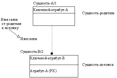 Рис. 2.32. Идентифицирующая связь Пунктирная линия изображает неидентифицирующую связь (рисунок 2.33). Сущность-потомок в неидентифицирующей связи будет независимой от идентификатора, если она не является также сущностью-потомком в какой-либо идентифицирующей связи.