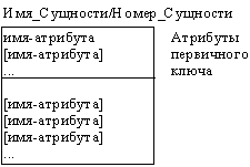 Рис. 2.34. Атрибуты и первичные ключи Сущности могут иметь также внешние ключи (Foreign Key), которые могут использоваться в качестве части или целого первичного ключа или неключевого атрибута. Внешний ключ изображается с помощью помещения внутрь блока сущности имен атрибутов, после которых следуют буквы FK в скобках (рисунок 2.35).