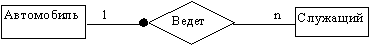 Рис. 2.37. Необязательная связь В отличие от необязательной связи в полной (total) связи участвуют все экземпляры хотя бы одной из сущностей. Это означает, что экземпляры такой связи существуют только при условии существования экземпляров другой сущности. Полная связь может иметь один из 4-х видов: обязательная связь, слабая связь, связь "супертип-подтип" и ассоциативная связь. Обязательная (mandatory) связь описывает связь между "независимой" и "зависимой" сущностями. Все экземпляры зависимой ("обязательной") сущности могут существовать только при наличии экземпляров независимой ("необязательной") сущности, т.е. экземпляр "обязательной" сущности может существовать только при условии существования определенного экземпляра "необязательной" сущности. В примере (рисунок 2.38) подразумевается, что каждый автомобиль имеет по крайней мере одного водителя, но не каждый служащий управляет машиной.