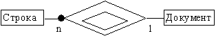 Рис. 2.38. Обязательная связь В слабой связи существование одной из сущностей, принадлежащей некоторому множеству ("слабой") зависит от существования определенной сущности, принадлежащей другому множеству ("сильной"), т.е. экземпляр "слабой" сущности может быть идентифицирован только посредством экземпляра "сильной" сущности. Ключ "сильной" сущности является частью составного ключа "слабой" сущности. Слабая связь всегда является бинарной и подразумевает обязательную связь для "слабой" сущности. Сущность может быть "слабой" в одной связи и "сильной" в другой, но не может быть "слабой" более, чем в одной связи. Слабая связь может не иметь атрибутов. Пример на рисунке 2.39: ключ (номер) строки в документе может не быть уникальным и должен быть дополнен ключом документа.