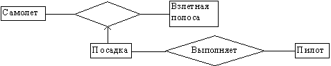 Рис. 2.40. Связь "супертип-подтип" В ассоциативной связи каждый экземпляр связи (ассоциативный объект) может существовать только при условии существования определенных экземпляров каждой из взаимосвязанных сущностей. Ассоциативный объект - объект, являющийся одновременно сущностью и связью. Ассоциативная связь - это связь между несколькими "независимыми" сущностями и одной "зависимой" сущностью. Связь между независимыми сущностями имеет атрибуты, которые определяются в зависимой сущности. Таким образом, зависимая сущность определяется в терминах атрибутов связи между остальными сущностями. В примере на рисунке 2.41 самолет выполняет посадку на взлетную полосу в заданное время при определенной скорости и направлении ветра. Поскольку эти характеристики применимы только к конкретной посадке, они являются атрибутами посадки, а не самолета или взлетной полосы. Пилот, выполняющий посадку, связан гораздо сильнее с конкретной посадкой, чем с самолетом или взлетной полосой.