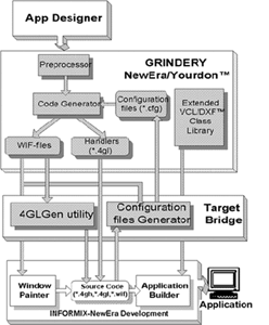 - генерацию приложения на любом языке, поддерживаемом семейством кодогенераторов GRINDERY (в настоящее время - Informix- 4GL, NewEra, SuperNova);