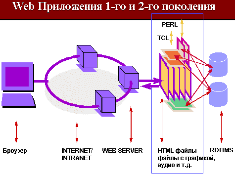 Ни одна из выше названных задач не может быть эффективно решена при использовании технологии web-узлов 1-го и 2-го поколения (см. рис.1).Проблема заключается в предоставлении технологии ( и реальных продуктов, работающих в рамках этой технологии) обеспечивающей максимально гибкую интеграцию баз данных в web-ориентированные приложения. Такую технологию и предлагает Informix с помощью IUWA - универсальной архитектуры для работы в WEB (рис. 2 ).