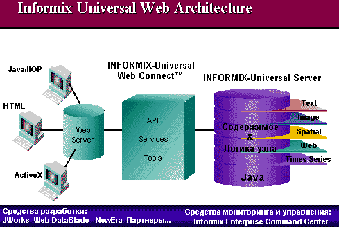 INFORMIX-Web DataBlade Module обеспечивает генерацию HTML страниц "на лету" на основе содержимого базы данных; поддерживает работу с любым браузером и web-сервером; поддерживает стандарты CGI, ISAPI, NSAPI, SGML; имеет мощное средство разработки и контроля Application Page Builder c набором готовых шаблонов.