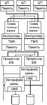 Три процессора выполняют одинаковые потоки команд, но работают с независимой синхронизацией. Процессоры синхронизируются во время обработки обращений к глобальной памяти и при обслуживании внешних прерываний. Все обращения к глобальной памяти с выходов резервируемых процессоров поступают через схемы голосования в пару контроллеров TMR. Схемы голосования на основе сравнения обращений между собой обнаруживают возможные неисправности процессоров и посылают достоверные запросы в остальную часть системы. Для обнаружения неисправностей в конструкциях контроллера TMR и процессора в/в используются средства самоконтроля. Каждый периферийный контроллер содержит стандартную плату VME, которая через специальную плату адаптера подсоединяется к паре шин в/в, защищенных четностью. Плата адаптера позволяет осуществлять коммутацию контроллера с двумя процессорами в/в.