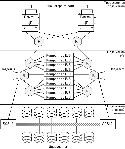 На рис. 4.8 показана архитектура типичной системы, построенной на базе ServerNet. Эта система состоит из нескольких процессорных узлов и узлов ввода/вывода, объединенных друг с другом системной сетью ServerNet. Базовым элементом системной сети ServerNet является маршрутизатор, выполненный в виде отдельной заказной СБИС. Для обеспечения отказоустойчивости предполагается возможность построения двух независимых подсетей ServerNet: X и Y. В типовой конфигурации системы большинство ее узлов имеют двухпортовые интерфейсы, обеспечивающие подсоединение каждого узла к этим независимым подсетям. Одной из дополнительных возможностей новой архитектуры является наличие специальной шины когерентности, допускающей подключение до четырех ЦП. Эта шина обеспечивает согласованное состояние общей для нескольких процессорных узлов памяти и их кэшей при выполнении программ, разработанных в расчете на мультипроцессорную обработку в системе с разделяемой общей памятью.