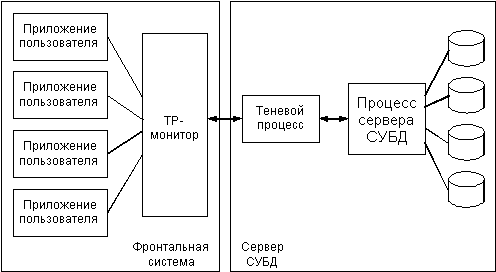 TP-монитор. Это особенно важно, когда СУБД относится к классу "2N", поскольку в этом случае используется только один теневой процесс (для обеспечения соединения с TP-монитором), а не по одному процессу на каждый процесс конечного пользователя (рис. 2.4). Это может существенно сократить накладные расходы, связанные с переключением контекста на сервере СУБД.
