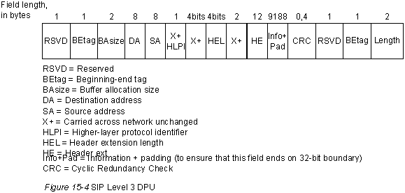 Уровень 3 Задачи, выполняемые уровнем 3 SIP, включают в себя формирование пакета "единиц данных обслуживания SMDS" (service data units (SDU)) в заголовке и концевике уровня 3. Затем "eдиницы данных протокола" (protocol data units (PDU)) разбиваются на PDU уровня 2 таким образом, чтобы соответствовать спецификациям уровня 2. PDU уровня 3 SIP достаточно сложна. Она изображена на Рис. 15-4.