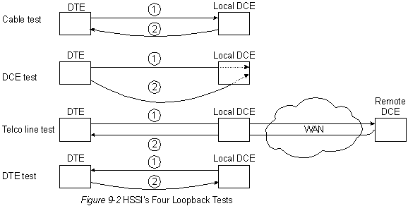 Figure 9-1 HSSI Technical Characteristics Максимальная скорость передачи сигнала HSSI равна 52 Mb/сек. На этой скорости HSSI может оперировать скоростями Т3 (45 Mb/сек) большинства современных быстродействующих технологий WAN, скоростями Office Channel (OC)-1 (52 Mb/сек) иерархии синхронной цифровой сети (SDN), а также может легко обеспечить высокоскоростное соединение между локальными сетями, такими, как Token Ring и Ethernet. Применение дифференциальных логических схем с эмиттерным повторителем (ЕCL) позволяет HSSI добиться высоких скоростей передачи информации и низких уровней помех. ECL использовалась в интерфейсах Cray в течение нескольких лет; эта схема определена стандартом сообщений High-Perfomance Parallel Interface (HIPPI), разработанным ANSI, для связей LAN с суперкомпьютерами. ECL-это имеющаяся в готовом виде технология, которая позволяет превосходно восстанавливать синхронизацию приемника, результатом чего является достаточный запас надежности по синхронизации. Гибкость синхронизации и протокола обмена информацией HSSI делает возможным выделение полосы пропускания пользователю (или поставщику). DCE управляет синхронизацией путем изменения ее скорости или путем стирания импульсов синхронизации. Таким образом DCE может распределять полосу пропускания между прикладными задачами. Например, PВX может потребовать одну величину полосы пропускания, роутер другую величину, а расширитель канала-третью. Распределение полосы пропускания является ключом для того, чтобы сделать Т3 и другие услуги широкой полосы (broadband) доступными и популярными. HSSI использует субминиатюрный, одобренный FCC 50-контактный соединитель, размеры которого меньше, чем у его аналога V.35. Чтобы уменьшить потребность в адаптерах для соединения двух вилок или двух розеток, соединители кабеля HSSI определены как вилки. Кабель HSSI использует такое же число контактов и проводов, как кабель интерфейса Small Computer Systems Interface 2 (SCSI-2), однако технические требования HSSI на электрические сигналы более жесткие. Для любого из высших уровней диагностического ввода, HSSI обеспечивает четыре проверки петлевого контроля. Эти тесты показаны на Рис. 9-2 "четыре теста петлевого контроля HSSI". Первый тест обеспечивает контроль кабеля локальной сети, т.к. сигнал закольцовывается, как только он доходит до порта DTE. Сигнал второго теста доходит до линейного порта локального DСE. Сигнал трeтьего теста доходит до линейного порта отдаленной DCE. И наконец, четвертый тест представляет собой инициируемую DCE проверку устройством DTE порта DCE.