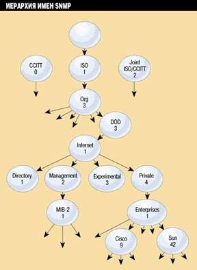 Управление сетью осуществляется со станций управления, которые представляют собой компьютеры общего назначения со специальным программным обеспечением для управления. Станции управления выполняют один или более процессов, взаимодействующих с агентами по сети. При такой схеме вся сложность (и вся интеллектуальность) сосредоточена на станциях управления, чтобы агенты были как можно более просты и чтобы они потребляли как можно меньшие ресурсы устройств, на которых выполняются. Спрашивать, например, у маршрутизатора, сколько пакетов было потеряно, бессмысленно, если он не ведет их учет или не понимает запроса. Поэтому SNMP самым тщательным образом описывает, какую информацию агент должен собирать и в каком формате ее следует предоставлять. Таким образом, каждое устройство поддерживает несколько переменных с описанием своего состояния. Все возможные переменные объединены в такую структуру, как база управляющей информации. Станции управления взаимодействуют с агентами с помощью протокола SNMP. Он позволяет станции запрашивать значения локальных переменных агента и при необходимости изменять их. Однако иногда в сети могут происходить нежелательные события. Управляемые узлы могут сломаться, линии связи — выйти из строя и т. п. Как только агент замечает какое-либо значительное событие, он немедленно сообщает о нем всем станциям из своего конфигурационного списка. Это сообщение называется прерыванием SNMP. Агент лишь сообщает о событии, а все подробности станция управления должна выяснять самостоятельно. Из-за ненадежности коммуникаций между станцией и агентами (получение сообщений не подтверждается) каждая станция периодически проводит опрос управляемых узлов для выявления необычных событий. Такая модель опроса через длительные интервалы времени с немедленным опросом при получении прерывания называется инициируемым прерываниями опросом. СТРУКТУРА УПРАВЛЯЮЩЕЙ ИНФОРМАЦИИСтруктура управляющей информации (Structure of Management Information, SMI) определяет допустимые в базе управляющей информации типы данных и способы их представления. Кроме того, она определяет иерархическую структуру имен, чтобы управляемые объекты имели уникальные однозначные имена. SMI представляет своего рода надподмножество ASN.1 — она использует часть типов данных этого стандарта и вводит несколько своих типов данных. (АSN — абстрактное описание синтаксиса — представляет собой стандартный язык описания объектов, принятый в OSI. Как и многие другие протоколы OSI, он сложен, громоздок и неэффективен.) Для того чтобы агенты и менеджеры могли управлять объектами в сети со множеством устройств и протоколов разных поставщиков, объекты должны быть описаны, а также стандартным образом закодированы для передачи по сети. Термин "объекты" относится к переменным, описывающим состояние устройства. Он несколько сбивает с толку, так как это далеко не те же объекты, что и в объектно-ориентированных системах, в частности они имеют состояния, но не имеют методов (помимо чтения и записи значений объектов). Однако этот термин используется в официальных стандартах. Объекты базы управляющей информации обычно имеют шесть атрибутов. Как правило, это имя, например ifInErrors или tcpAttemptFails; идентификатор объекта в точечно-десятичной нотации вида 1.3.6.1.2.1.2.2.1.1.4; поле синтаксиса для выбора одног